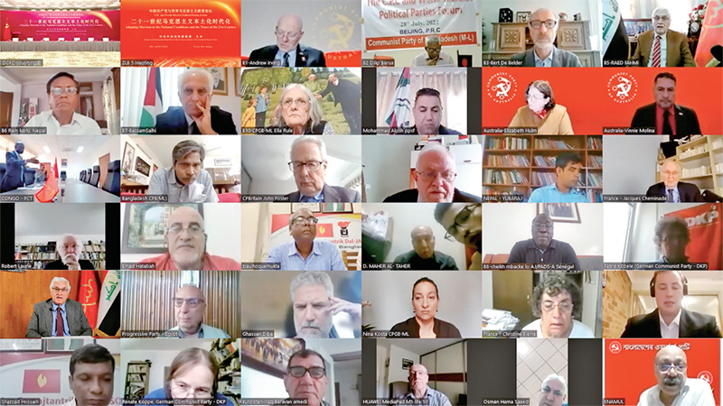2022年7月28日,中國共產黨與世界馬克思主義政黨論壇舉行。習近平總書記在賀信中強調,中國共產黨愿同各國馬克思主義政黨加強交流對話,立足本國國情,把準時代脈搏,不斷豐富和發(fā)展馬克思主義,在攜手推動構建人類命運共同體的進程中讓馬克思主義展現(xiàn)出更強大的真理力量。圖為外國政黨代表線上參加論壇。 中共中央對外聯(lián)絡部供圖