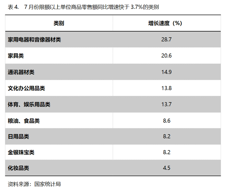 7月份,限額以上單位商品零售額同比增速快于社會消費(fèi)品零售總額3.7%增速的共有9類,即家用電器和音像器材類同比增長28.7%,家具類增長20.6%,通訊器材類增長14.9%,文化辦公用品類增長13.8%,體育、娛樂用品類增長13.7%,糧油、食品類增長8.6%,日用品類增長8.2%,金銀珠寶類增長8.2%,化妝品類增長4.5%。