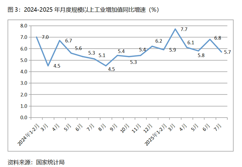 (一)工業(yè)增速由升轉(zhuǎn)落。7月份,規(guī)模以上工業(yè)增加值同比增長5.7%,比上月增長6.8%回落了1.1個百分點(diǎn),6月份比5月份回升了1.0個百分點(diǎn)。從工業(yè)三大門類看,采礦業(yè)和制造業(yè)增速比上月回落,電力、熱力、燃?xì)饧八a(chǎn)和供應(yīng)業(yè)增速回升,7月份采礦業(yè)同比增長5.0%,比上月回落1.1個百分點(diǎn);制造業(yè)增長6.2%,比上月回落1.2個百分點(diǎn);電力、熱力、燃?xì)饧八a(chǎn)和供應(yīng)業(yè)增長3.3%,比上月回升1.5個百分點(diǎn)。今年以來工業(yè)增速波動的運(yùn)行,反映出工業(yè)的回升仍缺乏穩(wěn)固的基礎(chǔ)。