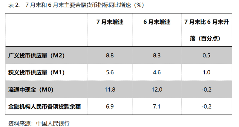 (二)M2增速持續(xù)回升。7月末,廣義貨幣供應(yīng)量(M2)同比增長8.8%,比6月末增長8.3%回升0.5個百分點(diǎn),6月末增速比5月末7.9%的增速回升了0.4個百分點(diǎn),保持了持續(xù)回升勢頭;狹義貨幣供應(yīng)量(M1)同比增長5.6%,比6月末增長4.6%回升1.0個百分點(diǎn),6月末增幅比5月末2.3%增幅回升2.3個百分點(diǎn);流通中貨幣(M0)增速持續(xù)小幅回落,7月末同比增長11.8%,比6月末增長12.0%回落0.2個百分點(diǎn),而6月末增速比5月末增速回落0.1個百分點(diǎn)。7月末M2和M1增速的持續(xù)回升,M0增速的基本持平,表明貨幣政策仍在向適度寬松方向的要求運(yùn)行, M1緩慢的增長仍需要給予高度關(guān)注。