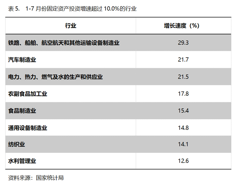 1-7月份,固定資產(chǎn)投資增速超過10.0%的主要行業(yè)共8個,即鐵路、船舶、航空航天和其他運(yùn)輸設(shè)備制造業(yè)增長29.3%,汽車制造業(yè)增長21.7%,電力、熱力、燃?xì)饧八纳a(chǎn)和供應(yīng)業(yè)增長21.5%,農(nóng)副食品加工業(yè)增長17.8%,食品制造業(yè)增長15.4%,通用設(shè)備制造業(yè)增長14.8%,紡織業(yè)增長14.1%,水利管理業(yè)增長12.6%。