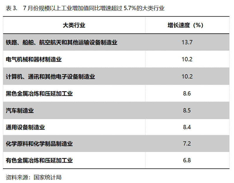 7月份,增長速度超過規(guī)模以上工業(yè)增長5.7%的主要大類行業(yè)共有8個,即鐵路、船舶、航空航天和其他運(yùn)輸設(shè)備制造業(yè)同比增長13.7%,電氣機(jī)械和器材制造業(yè)增長10.2%,計(jì)算機(jī)、通訊和其他電子設(shè)備制造業(yè)增長10.2%,黑色金屬冶煉和壓延加工業(yè)增長8.6%,汽車制造業(yè)增長8.5%,通用設(shè)備制造業(yè)增長8.4%,化學(xué)原料和化學(xué)制品制造業(yè)增長7.2%,有色金屬冶煉和壓延加工業(yè)增長6.8%。