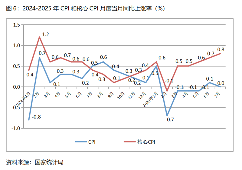 (四) CPI漲幅比上月回落。7月份,CPI同比漲幅持平,比6月份上漲0.1%回落0.1個百分點(diǎn), 自3月份以來一直保持在-0.1-0.1%區(qū)間,持續(xù)呈現(xiàn)低位運(yùn)行態(tài)勢。7月份,核心CPI同比上漲0.8%,比6月份上漲0.7%上升了0.1個百分點(diǎn)。雖然核心CPI漲幅保持回升的態(tài)勢,經(jīng)濟(jì)運(yùn)行活力有所增強(qiáng),但漲幅也十分有限,加之CPI一直處于較低水平,經(jīng)濟(jì)運(yùn)行活力仍較為偏弱,宏觀政策更加積極和寬松仍十分必要。